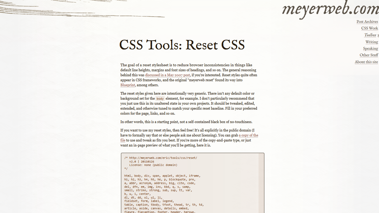 Eric Meyer's CSS Reset. I use this on every project. It resets the browser styling to reduce browser inconsistencies.
