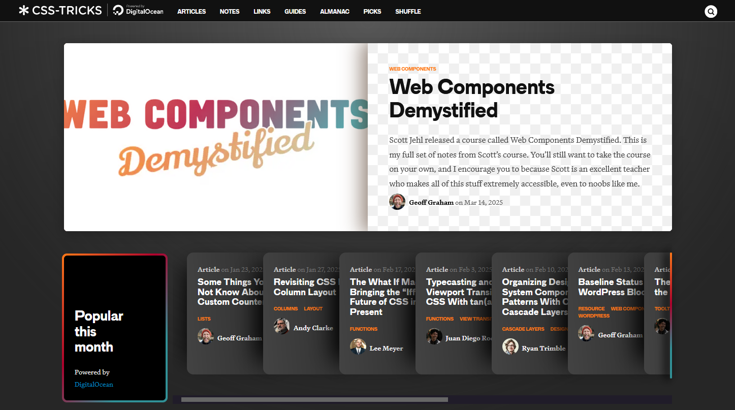 A great blog for articles and tutorials on CSS, JS, React, general web dev. Very well-made courses.